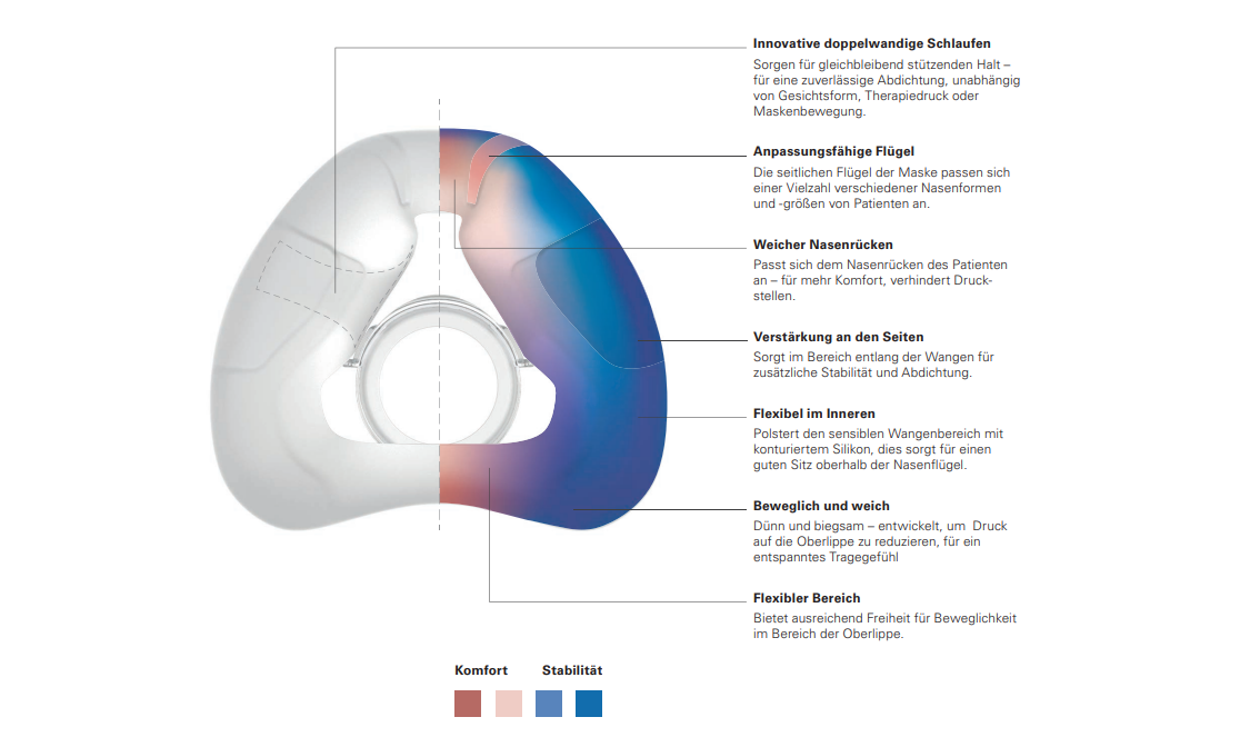 Das AirTouch-Maskenkissen aus Memory-Schaum bietet einen außergewöhnlichen Komfort. Das weiche, atmungsaktive und luftdurchlässige Material setzt neue Maßstäbe und fühlt sich leicht und frisch auf Ihrer Haut an - mit einem unvergleichlichen Tragegefühl.