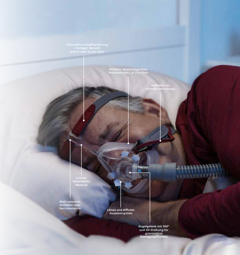 CARA überzeugt durch ihre Leichtigkeit, einem sanft anschmiegendes, passgenaues Maskenkissen, ein kleines, leises und diffuses Ausatemsystem sowie weitere Details, die das Leben leichter machen.