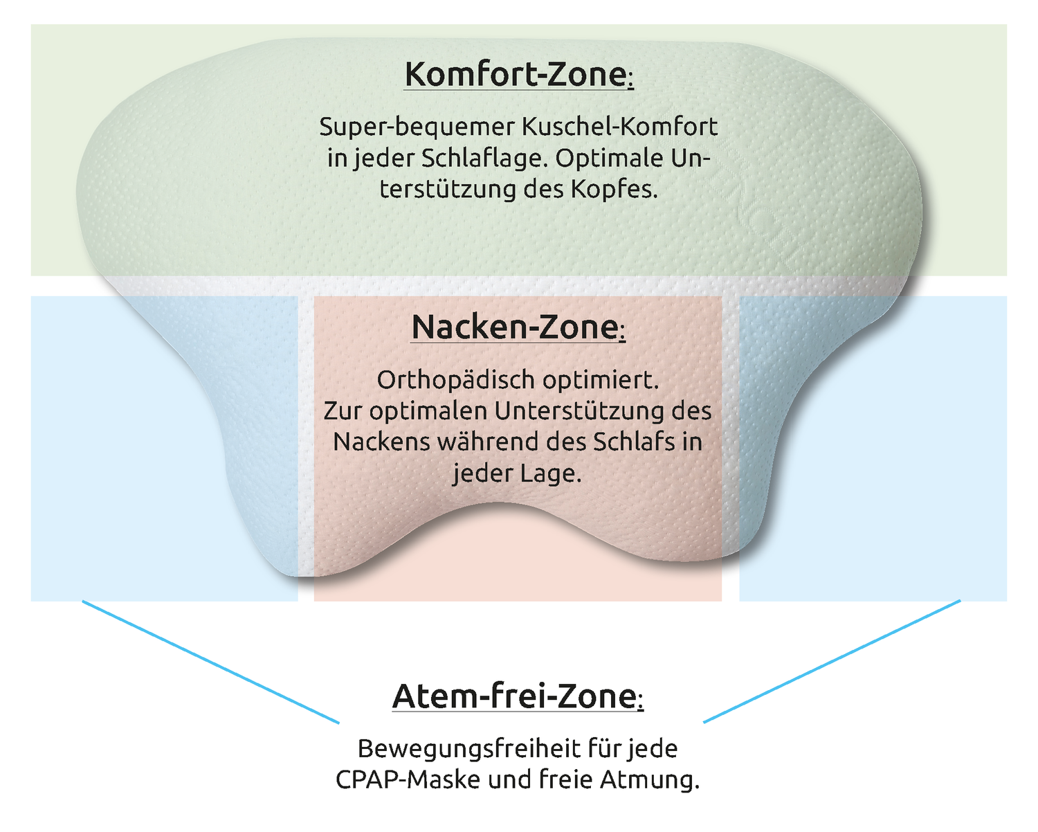 Durch die universelle Atem-frei-Zone ist unser LINA-Kissen für alle Masken-Arten geeignet. Eine freie Beweglichkeit von Maske und Schlauch sind sichergestellt. Ein Verrutschen der Maske wie bei normalen Kissen, die gegen die Maske drücken, ist hier so gut wie ausgeschlossen. So tut Ihr LINA-Kissen das Beste, um Ihnen die problemlose Funktion Ihrer CPAP-Maske sicherzustellen und Ihnen einen ruhigen und gesunden Schlaf zu garantieren.