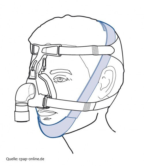 Da manche Menschen mit einer Full Face Maske nicht zurecht kommen, empfiehlt sich alternativ die Verwendung des ResMed Kinnbandes. Es soll das Öffnen des Mundes während der CPAP-Therapie einschränken und somit Leckagen durch den Mund reduzieren. Das ResMed Kinnband ist mit allen gängigen Nasen- oder Nasenpolstermasken kombinierbar.